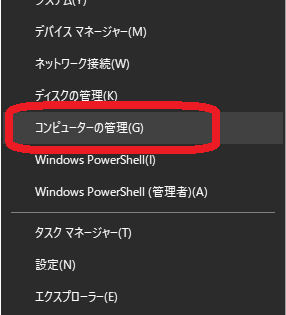 まずはwindowsマークを右クリックして、「コンピュータの管理」を選択します。