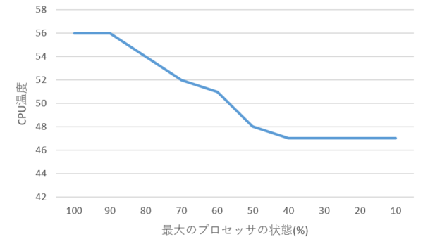 使用率100%から10%刻みで下げていった時のCPU温度の推移は以下。