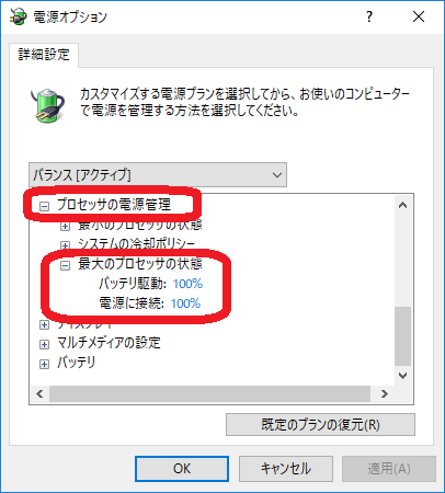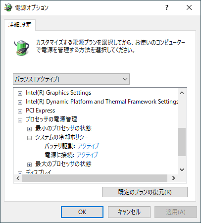 • 第2位:CPU性能の抑制とシステムの冷却ポリシーを「アクティブ」に