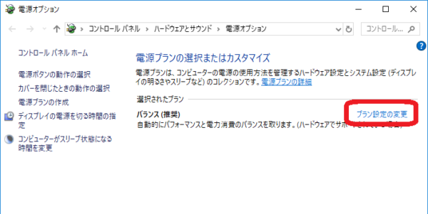 「電源オプション」が開きますので、画面右側の「プラン設定の変更」です。