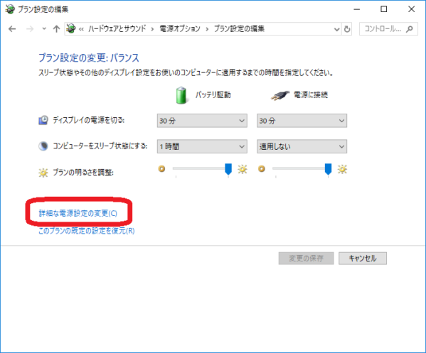 「プラン設定の編集」画面から「詳細な電源設定の変更」を選ぶと・・・