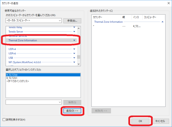 「カウンターの追加」が開きますので、A~Z順に並んでいる「使用可能なカウンター」の中から