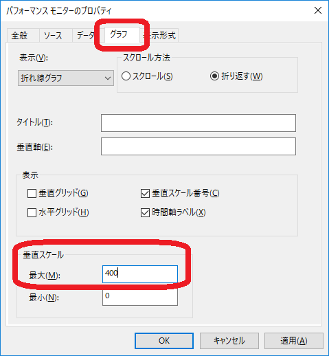 「パフォーマンス モニタのプロパティ」が開きますので、「グラフ」タブの一番下にある「垂直スケール」「最大(M)」の数字を、400などに変更してあげましょう。